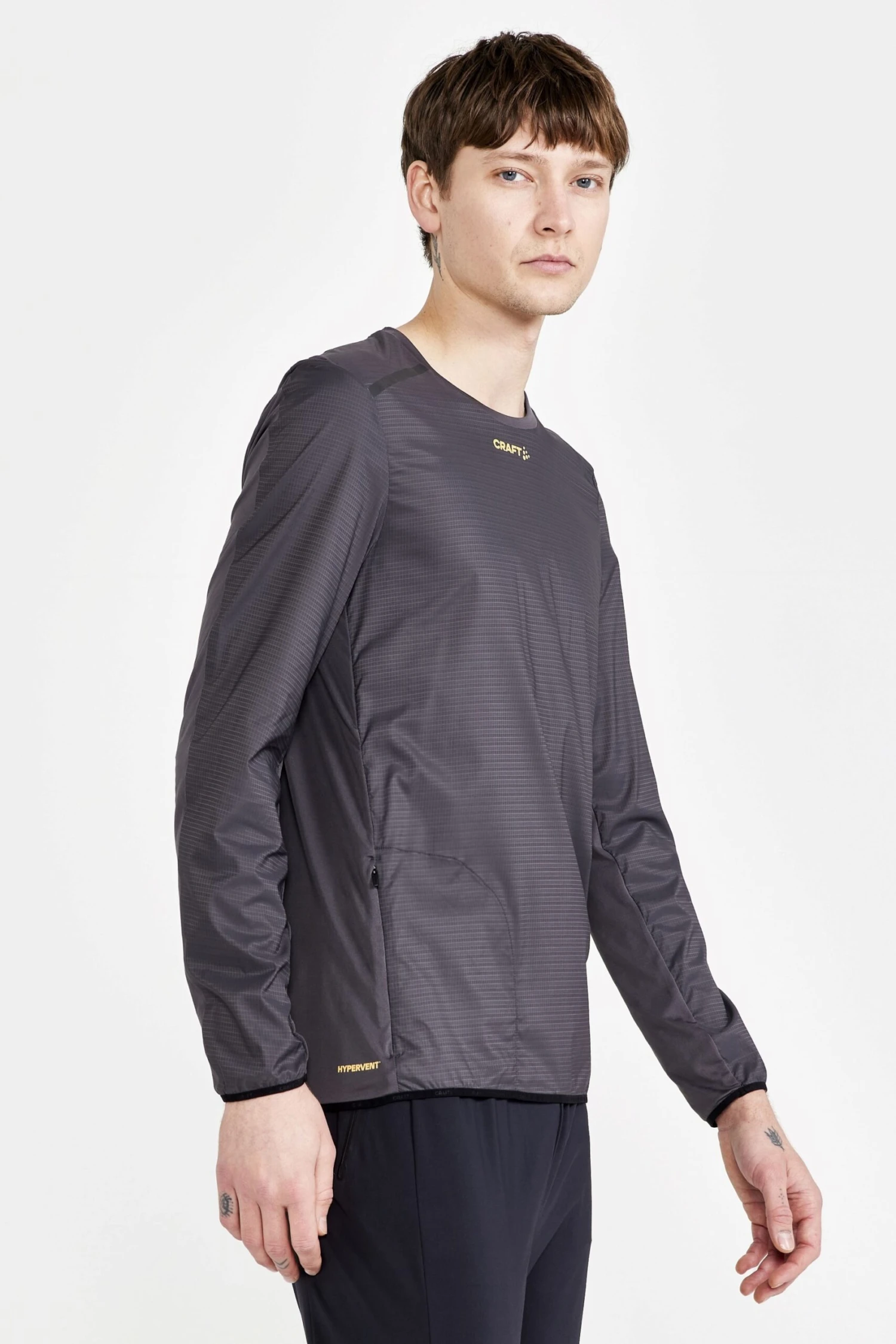 Pro-grade long-sleeve running tee with wind-protective ripstop front and highly ventilating jersey back for high-intensity workouts. Zip pocket for safe storage and long jersey cuffs with thumb grip.
