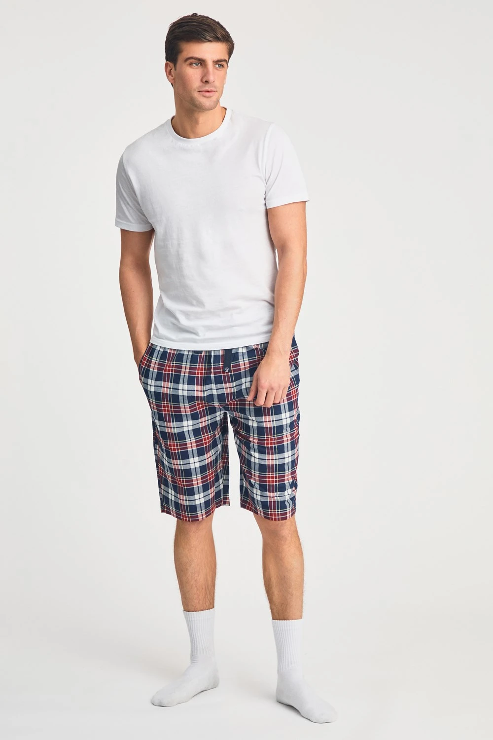 These Tokyo Laundry boxer-style checked lounge shorts are made from 100% cotton with a garment-washed finish for ultimate comfort. Designed with an elastic waistband and adjustable drawstring, they offer a relaxed fit, making them perfect for everyday lounging. Stylish, breathable, and effortlessly casual.
